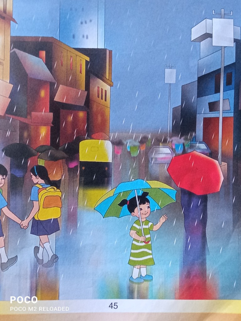 Answer: In the rainy days at school the little boys and girls, however are very happy they sail paper boats in the water, the streets look like small rivers to the children.